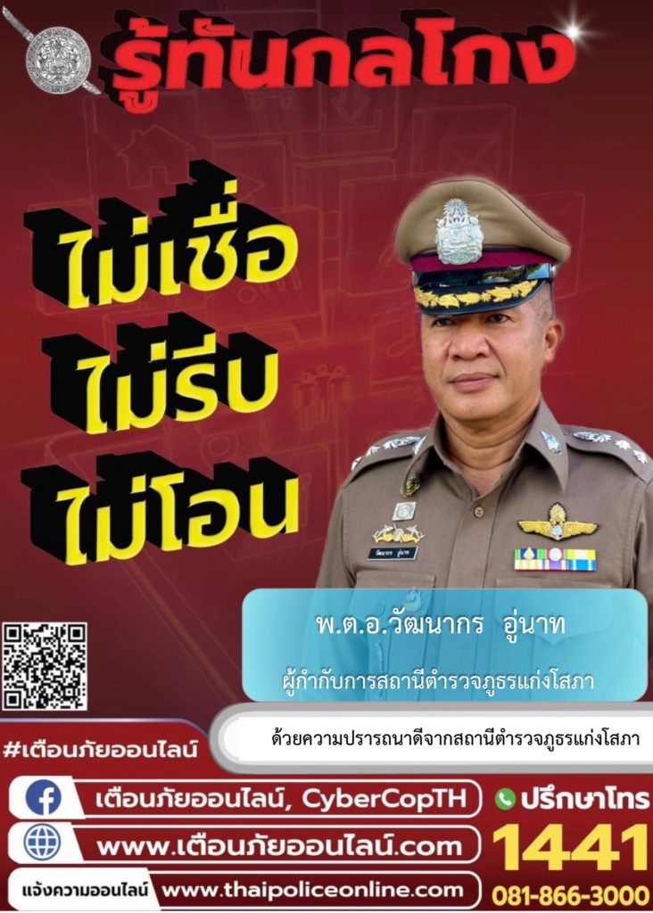 รู้ทันกลโกล 8 มกราคม 2567 โดย admin / ข่าวประชาสัมพันธ์,ข่าวกิจกรรม,ข่าวประชาสัมพันธ์,ข่าวฝากประชาสัมพันธ์ รู้ทันกลโกง ไม่เชื่อ ไม่รับ ไม่โอน ด้วยความปรารถนาดีจากสถานีตำรวจภูธรแก่งโสภา ปรึกษาโทร 1441 หรือ 081-866-3000 FacebookFacebookXXLINELine